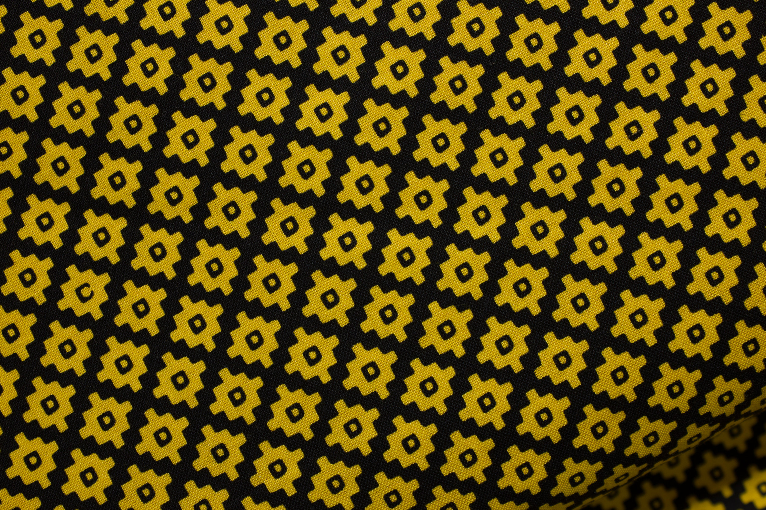 - Purple design with black, teal, and golden yellow accents. It looks like a floral design has been cut into squares and scrambled.