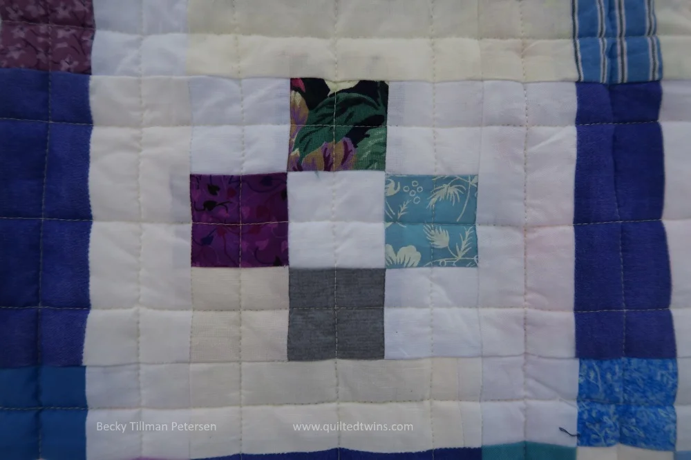 Just so you can see what I did with the quilting. I just straight line quilted down the middle of each of each of the blocks. I eye-balled it. I don't have the patience for that metal guide thing that is supposed to ride right along the seam line and you will end up with perfectly straight quilting.