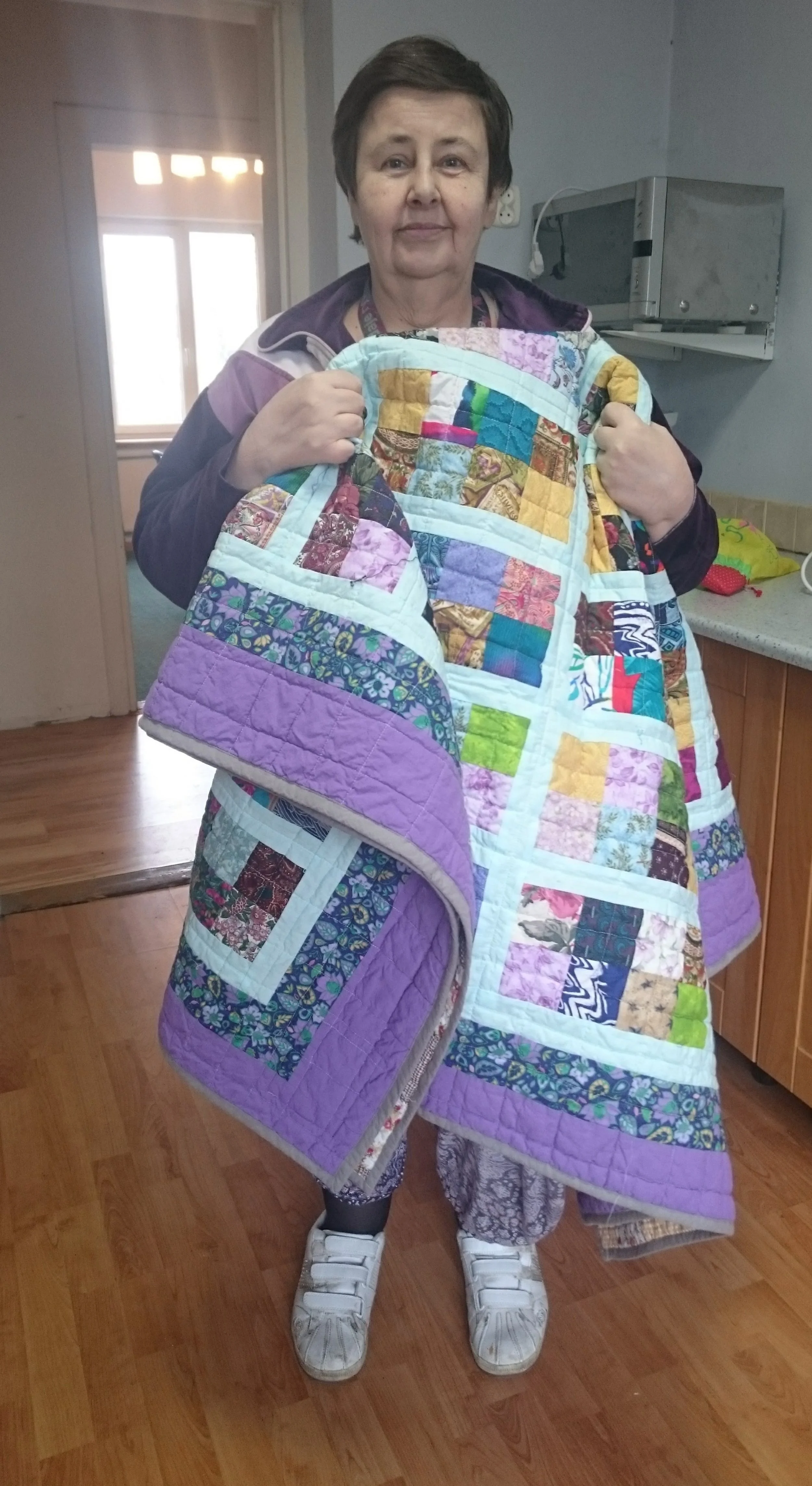 Here's a complete picture of her quilt. The top was made by a guild in Jacksonville, FL. I only added the borders in order to make it big enough for a European twin size.