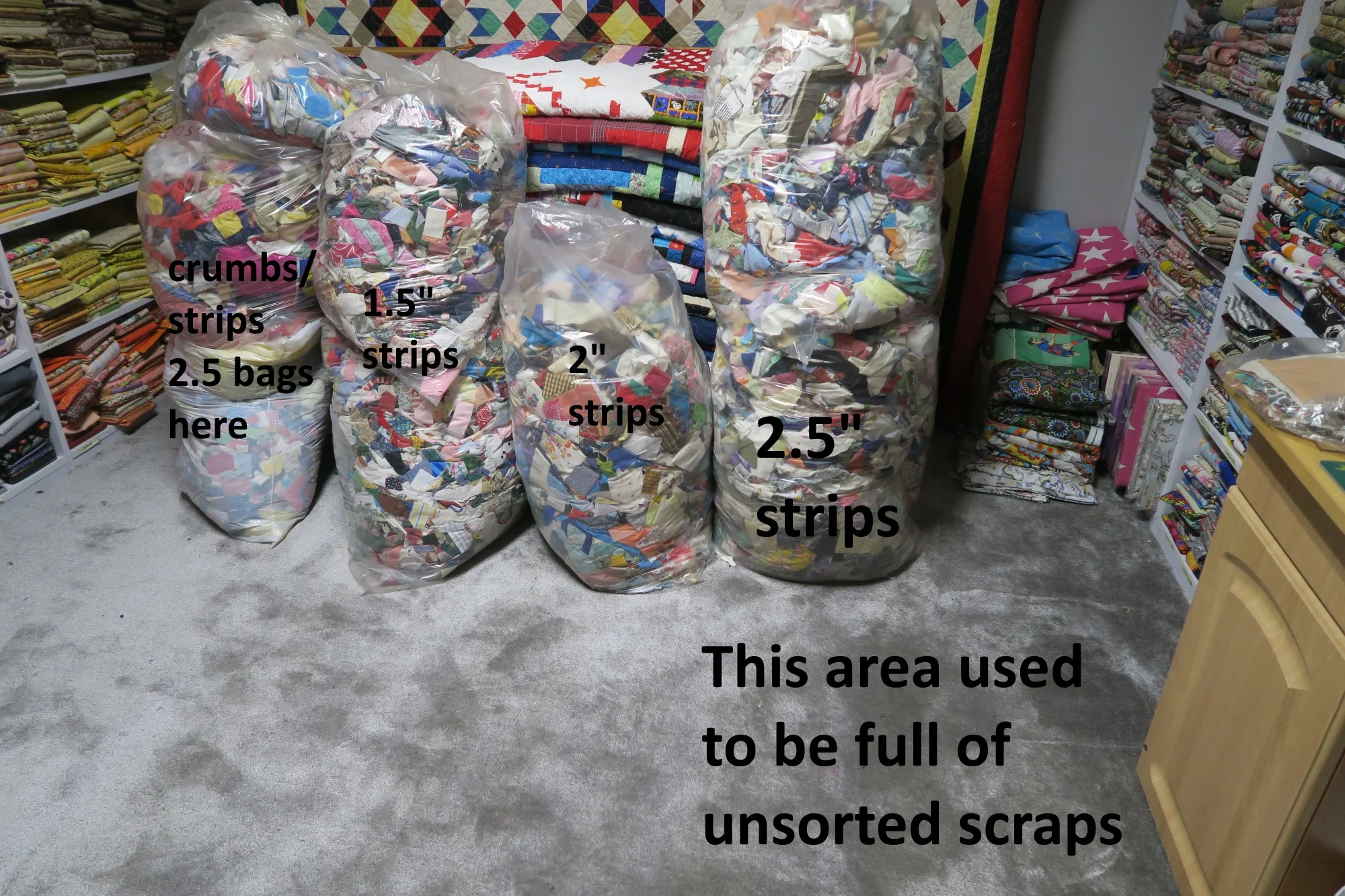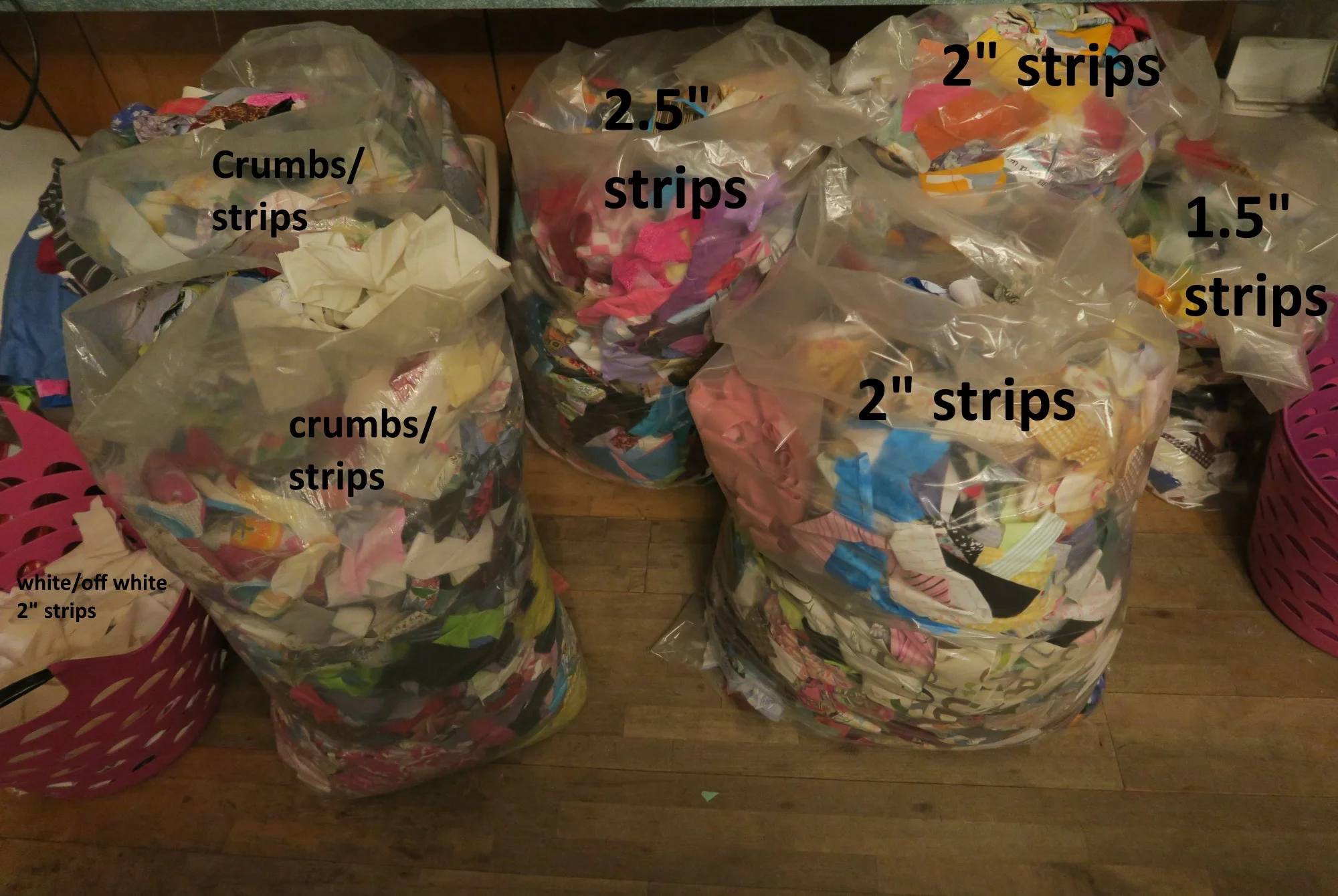 The scraps that are circled above along with the bunch in this box equaled several bags and about 3 laundry baskets (the long, rectangular kind, not small round kind) full. It took quite a while to go through them all. I have so many crumbs/strings because the Sizzix actually creates more strings than when I cut by hand with the rotary cutter. But I was able to really go at it hard today by using the Sizzix. I decided that those strings were worth it to get done. Plus, as I sorted, I found that I had bags of already sorted crumbs, direct from my sewing area.
