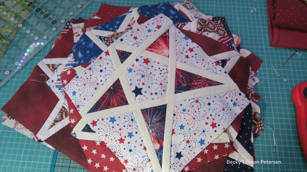 This was before the final layout. I was trying to mix up reds, and then the busy backgrounds, spread the blues around, change the direction of the stars. I had help with a student who was at our house for dinner - he moved some around as well.