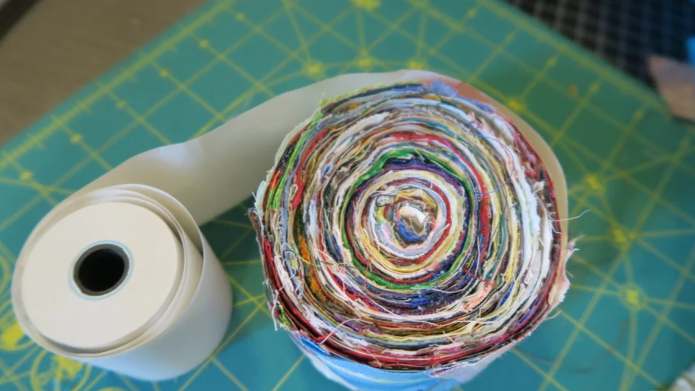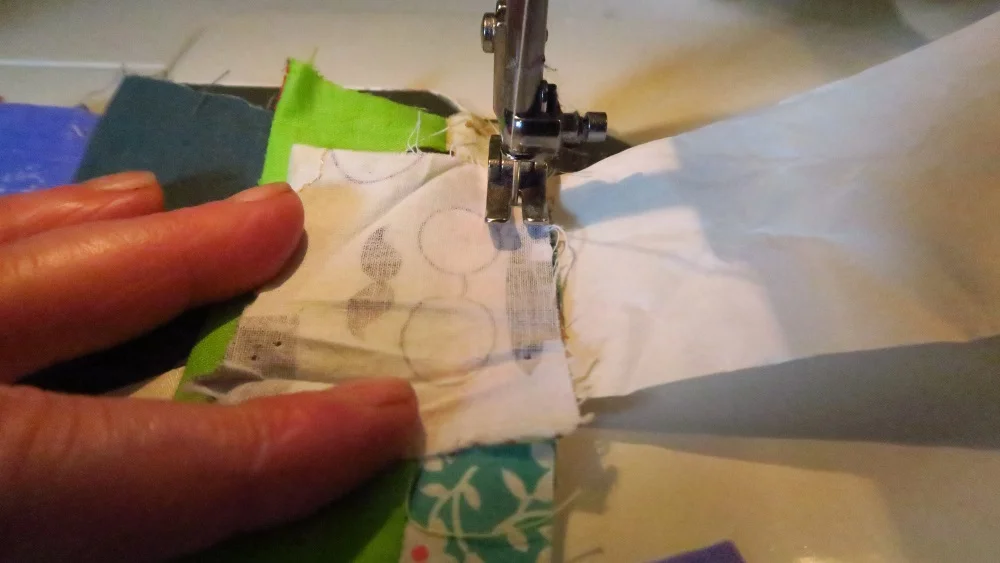 Add a new scrap to the top of the previous piece. Flip it over. Do it again. And again. And again. Today I only did about 3 feet of scraps.
