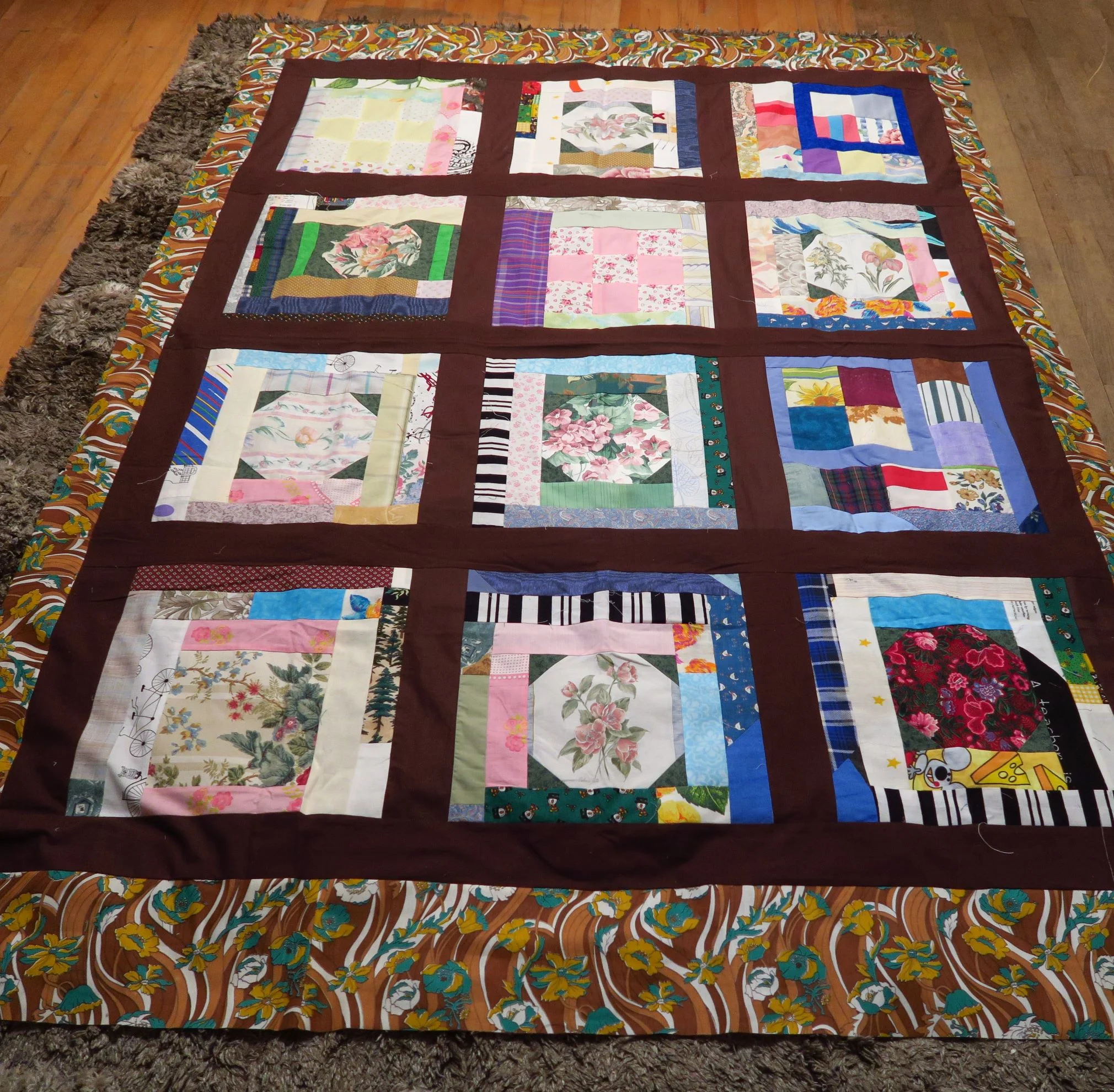 This is part of a strippy quilt I’m making. I didn’t really like the brown floral by Riley Blake that I had in my stash so I decided to “use it up” by sewing it into charity quilts. I’m trying to use up at least one whole shelf of florals! That’s going to be quite an accomplishment if I succeed.I have 3 or 4 shelves of “just florals”! It’s crazy!