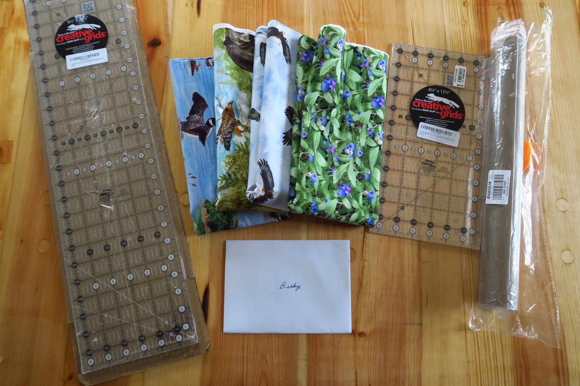 They include rulers, a thank you note from the couple who got the Alaska themed quilt, 4 pieces of fabric and some non stick baking sheets which I’m going to try instead of a Supreme Slider.