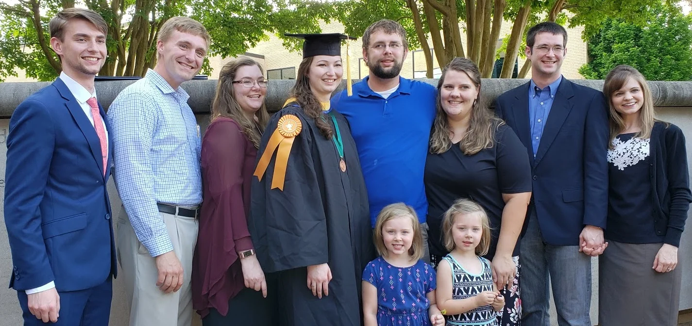 Daniel, (still in college), Zachary Rausch married to our daughter, Abigail Petersen Rausch who is next to Lydia, then Lydia in cap and gown, then Jeremiah, in the blue shirt next to his wife, Jessica Brown Petersen with our twin granddaughters - their girls, and then Timothy and his wife, Claire Darlin Petersen on the far right.