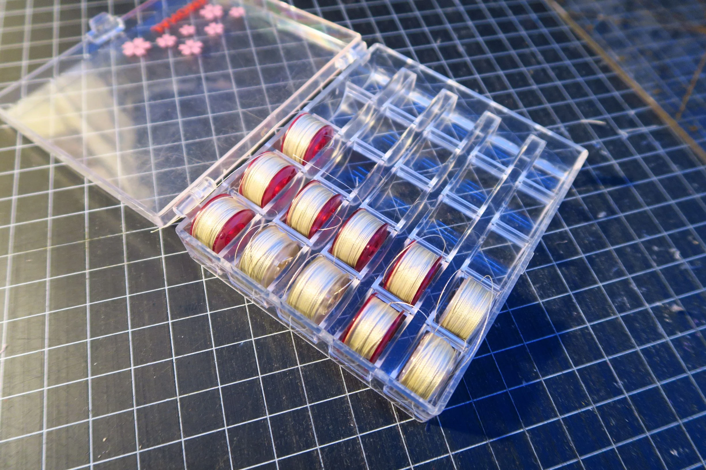 Then, I wound some bobbins for the quilting, set up my little side table which holds the weight of the quilt, cleared off everything that might get in the way or caught in the quilting from off my sewing area and got started quilting.