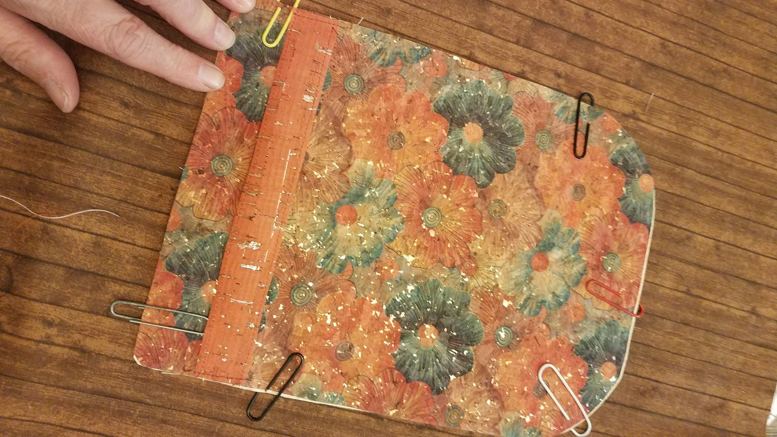 This was the trickiest part, because you can’t pin anything. The sides had to seat themselves and tuck just under each other, so that none of the cork backing was visible. Once again, I used my sturdy large paper clips to hold everything in place.