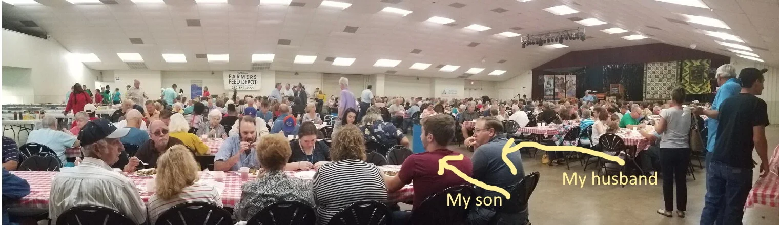We got there around 6 p.m., for the 6:30 supper. As we were piling out of the van, Peter said to us both, “Just think. Tonight I can win a quilt.” I said, “Well, that’s not going to happen. What are your chances? Pretty slim!” (Hold that thought), but I dismissed his comments as merely funny.