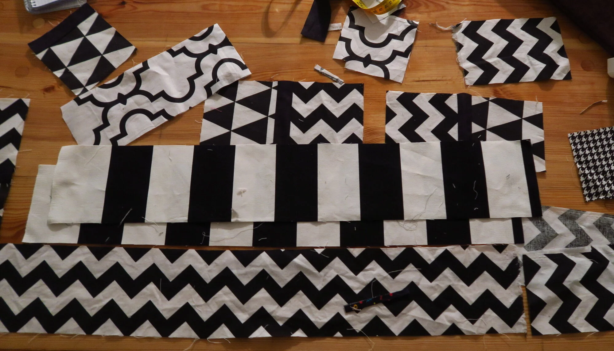This is all I have left of those geometric pieces. The two large strips on top are a heavier weight fabric. I have a few more backings to prepare - I’ll see if i can use up most of this in them.
