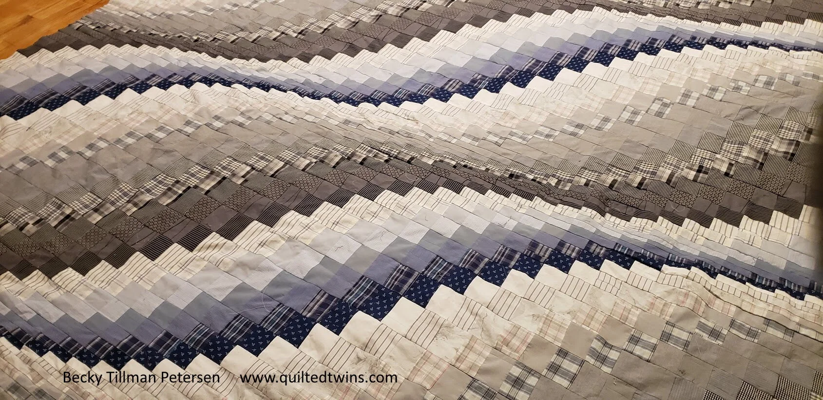 She told me she loves gray - and we talked about the bargello quilt I made for my friend Luanne. It goes together very quickly (considering it’s a big quilt) - and I thought it would be a great chance to show her what we can do with upcycleds. The other thing that works well for it is that one only needs 7 strips which I seem to be able to make from the average shirt that I get. Some, the larger ones, I can get more than that, but even a short sleeved shirt gives me 7 strips, it appears. If it has darts, well, then that’s a bit harder, of course.