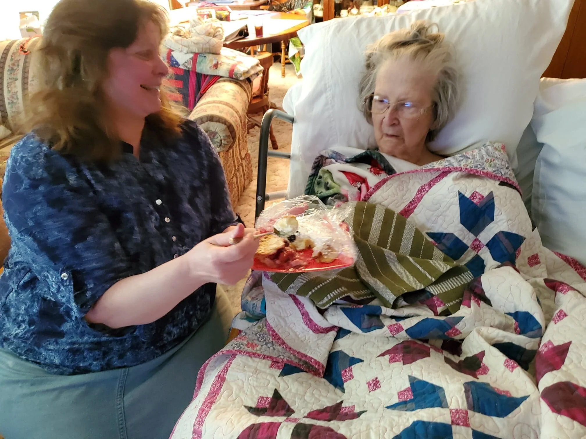 If mom needs water because she’s thirsty, she asks—I keep trying to push water down her. When she first came home, she didn’t want to eat much, so that was a big deal to try to get her to eat and drink. Thankfully her appetite has increased, so that isn’t a problem anymore. If she needs her glasses, I’ll get those for her. If she wants ice in her water, I’ll get it.