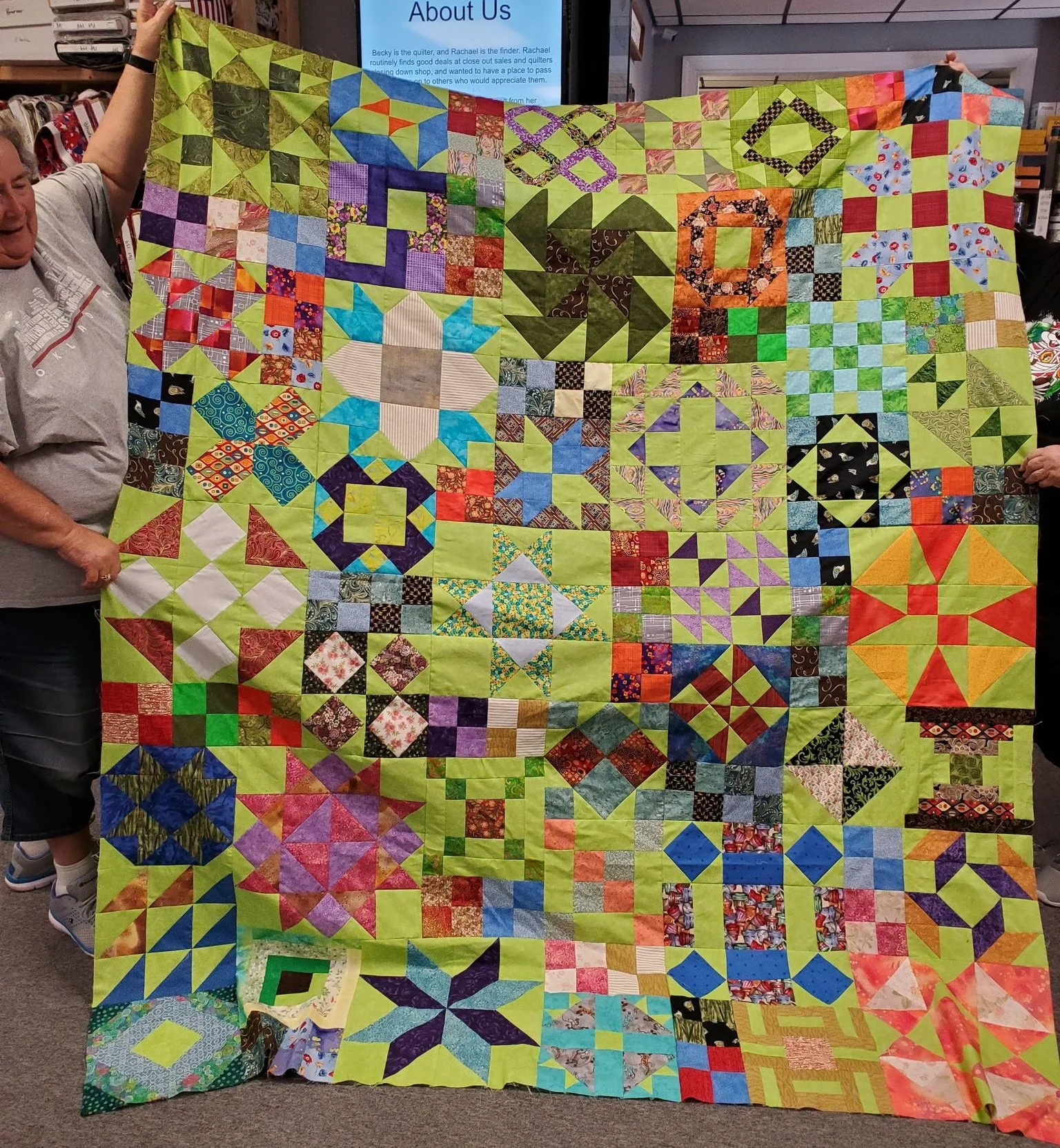 Virginia Stunkard is showing off her finished quilt with her hand painted squares which she painted years ago - she was in the shop when I was still there - and Sarah, especially, helped her with the colors. It turned out spectacularly!