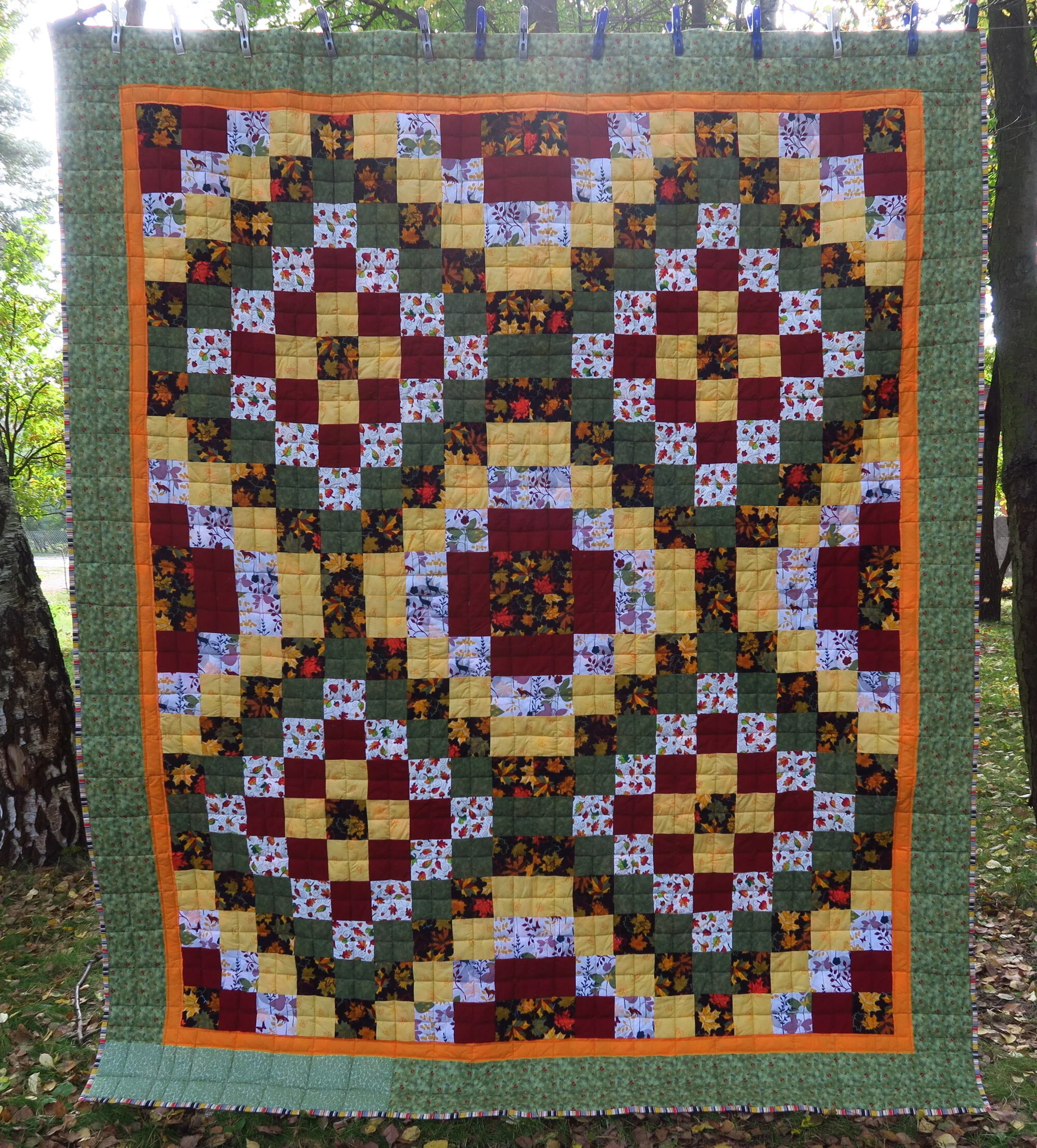 Oh, and if I would have noticed the mistakes in the rail fence before I sandwiched it, I would have fixed them. As I was looking at it hanging on the line, I noticed it and said, “Hmm…something looks wrong here.”