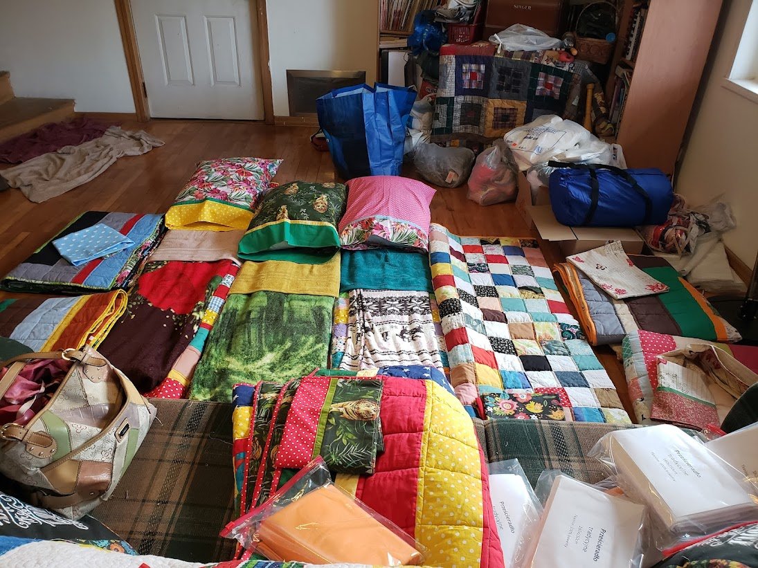 Apparently I failed to take a nice compact picture of all 10 of the pillowcases I made to go with these quilts. But here is a photo of where we were working on the floor. You can see some of these pillowcases.