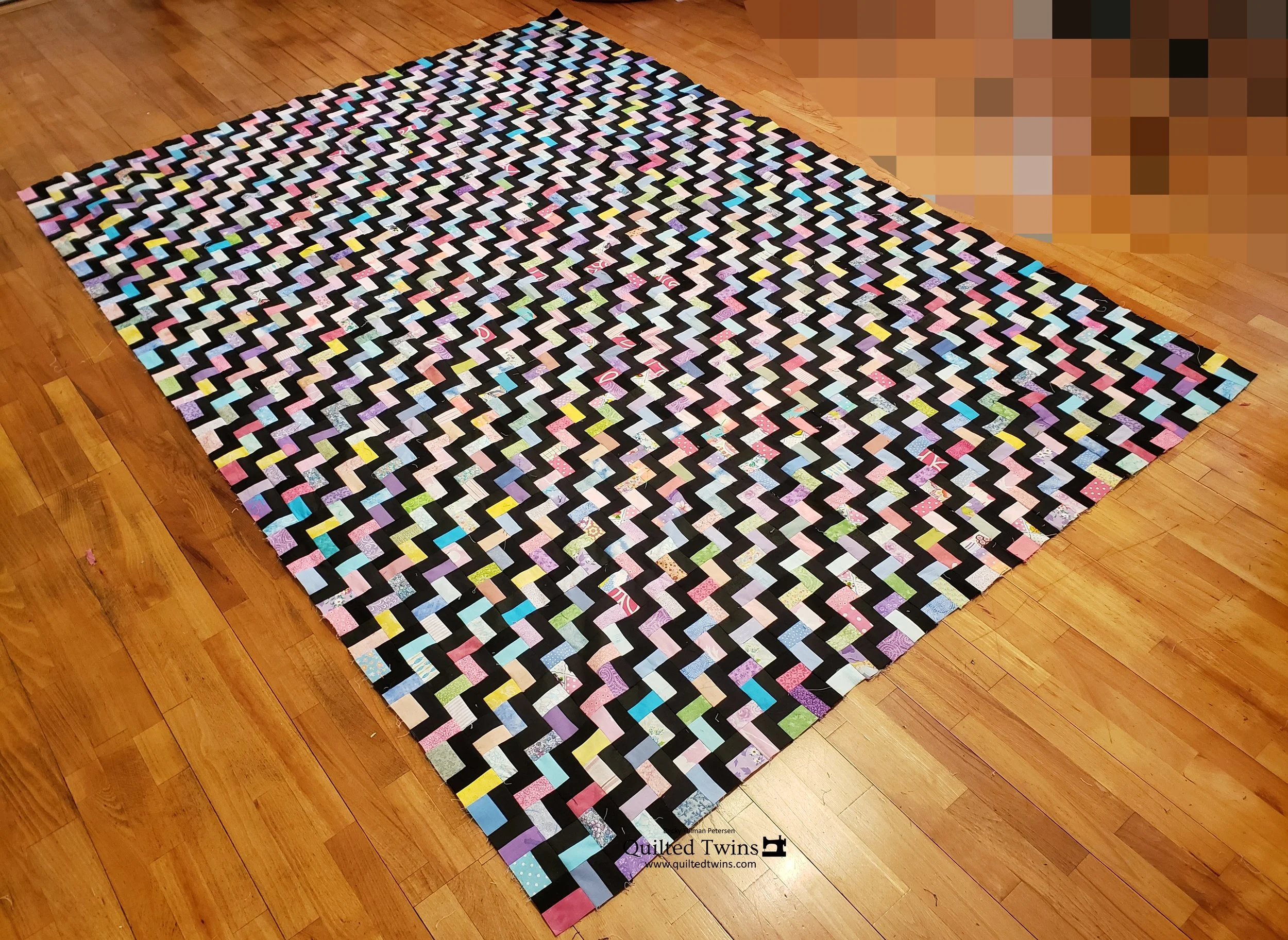 This one is coming right along. I have been doing some cutting, so whenever I ended up cutting some 1.5” black strips, I channeled them right to this project.