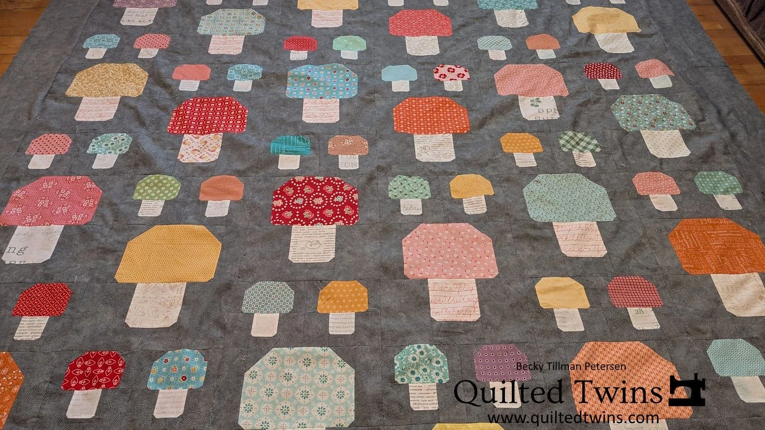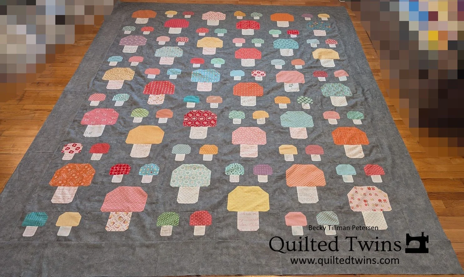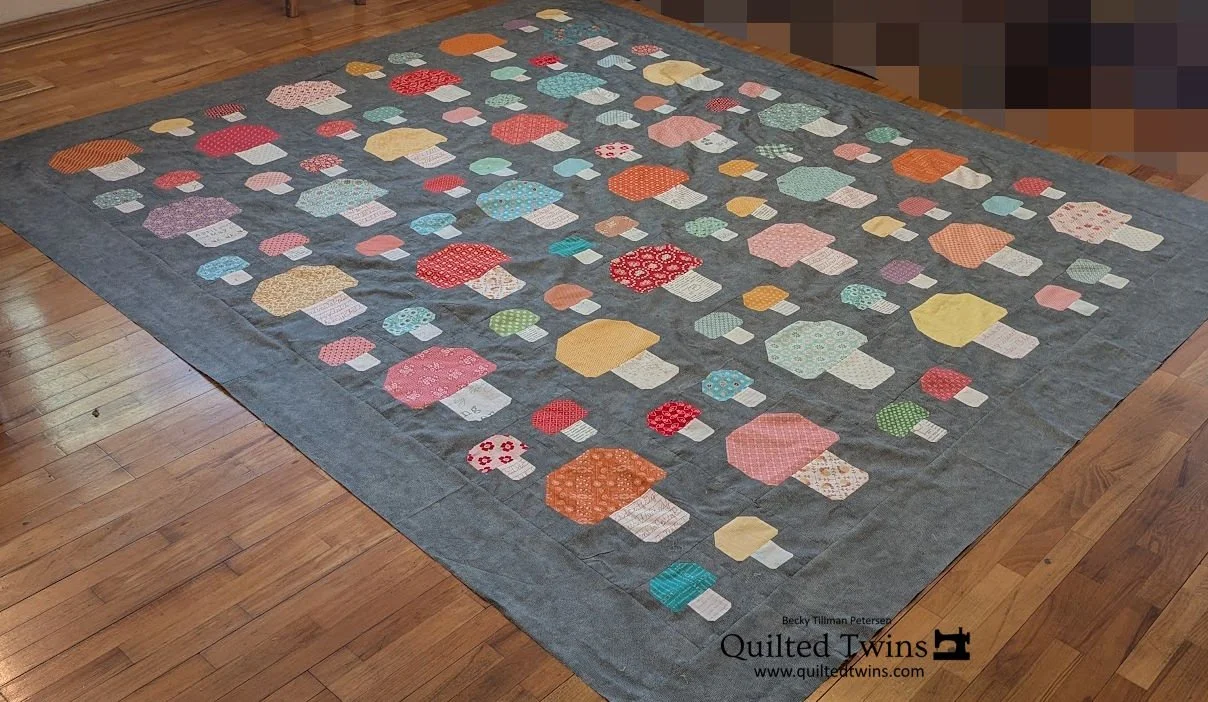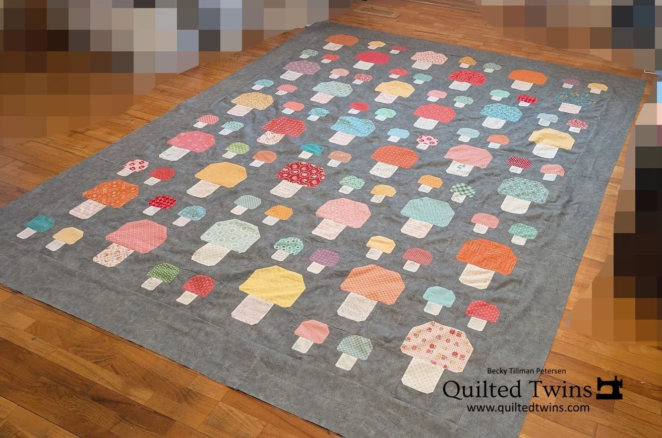 I made this quilt top 6 rows across and 5 down. The blocks are 12.5”x18.5” tall once I’ve sewn the big mushroom (12.5”x12.5”) to a group of 2 smaller mushrooms (6.5”x12.5”).