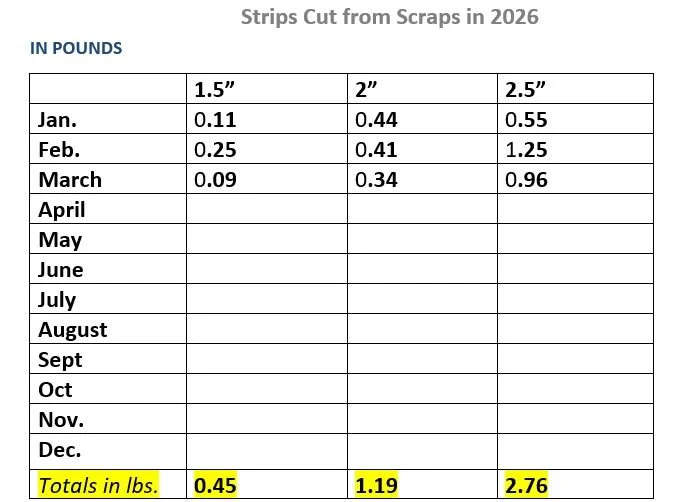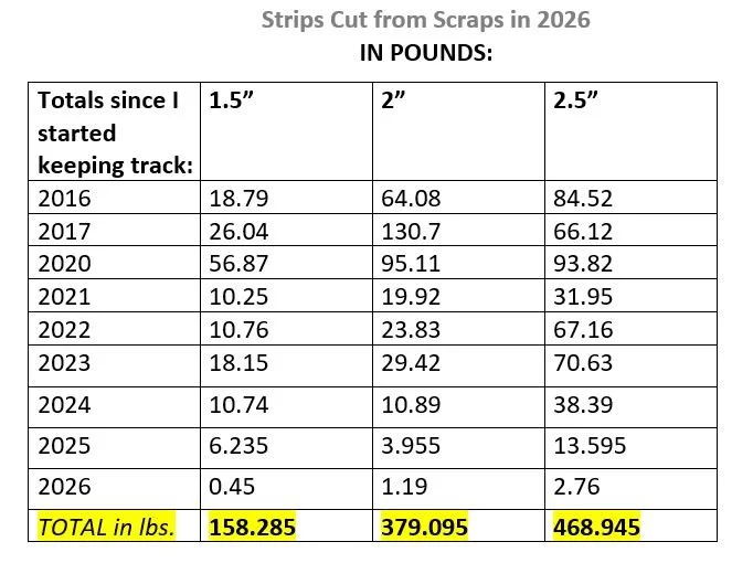 Here are the totals since I started keeping track when I had so many bags of scraps to deal with. I had taken them to the church because I had no more room in my house for them. But I did. It’s why I had so many in those early days.