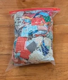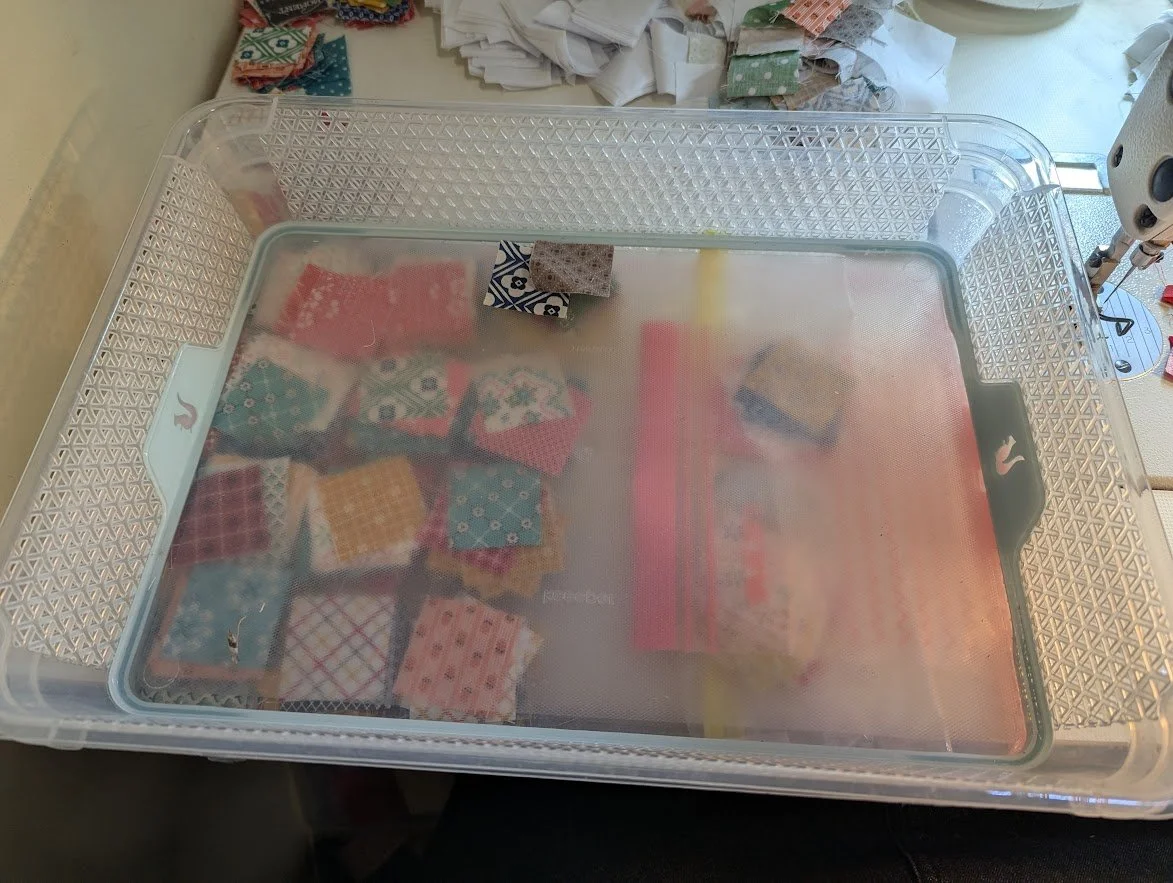 This is my stack of little 1.5” squares already divvied up to work on for each block. In this container I had laid out about 27 blocks, I think it was.