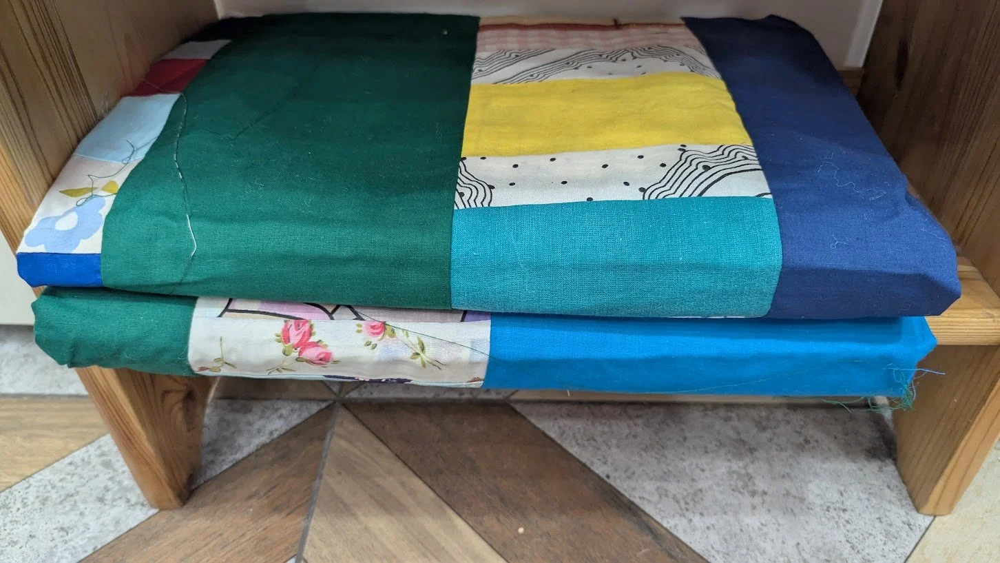 In fact, I have many bags of them, but I do need to go through them. I need to make sure they are the size I need and get them ready to go if they are not. Most of them are not the actual size I need. When I bring them from the states, if they are the actual 60”x80” or 55-60”x80+” I will be able to use them without any changes. It makes it so much quicker for me when it is time to quilt them if they are the 60”x80” (approx) I am looking for because of the size of the fabric I’m using for the backing I have.