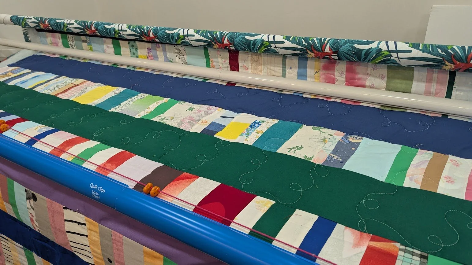 But I had had a lot of the quilt tops that I made with those little strips. I mean, a LOT of them! I remember making them a while ago now and am thrilled that I do have them ready to go. Let me show you what I mean - look to the right - it’s the quilt on the frame.
