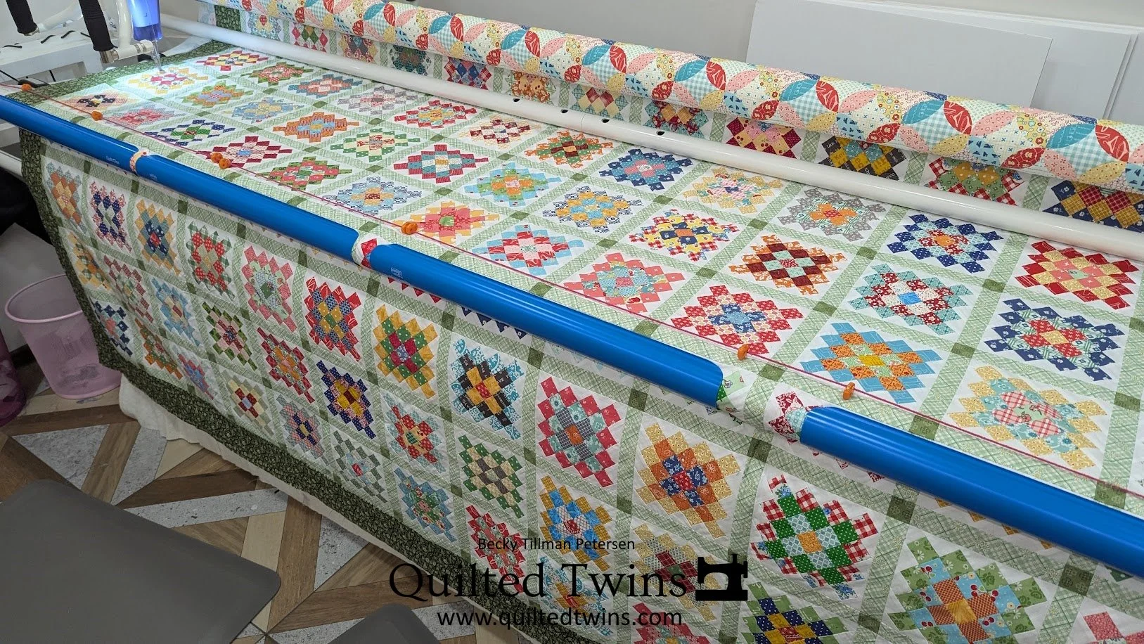 Then I got ahold of myself and said, “BECKY, this top has so much going on that you really won’t be able to see the quilting!” That actually settled myself down and helped me get psyched up to get this quilting done!