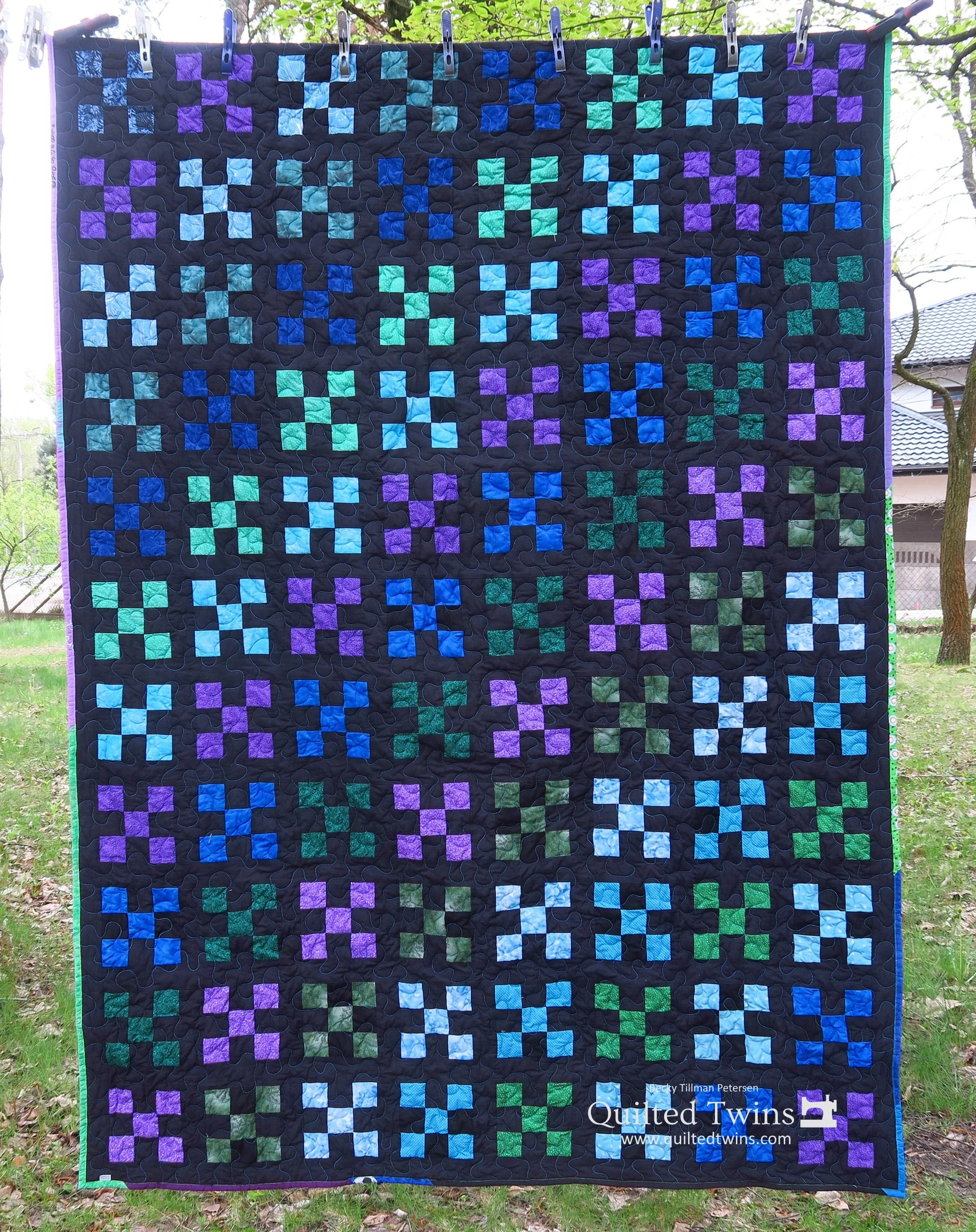 I have been playing around with these black and purple or black and green or blue 9 patches. I have three different ones that I designed and this is the second of the three. Eventually I hope to get the third one finished. It’s not started yet.