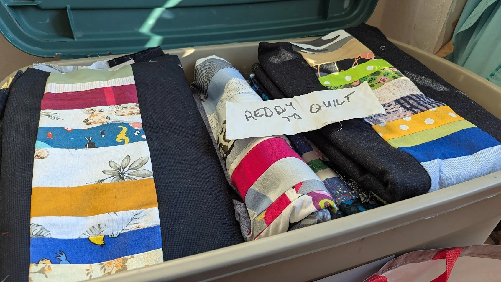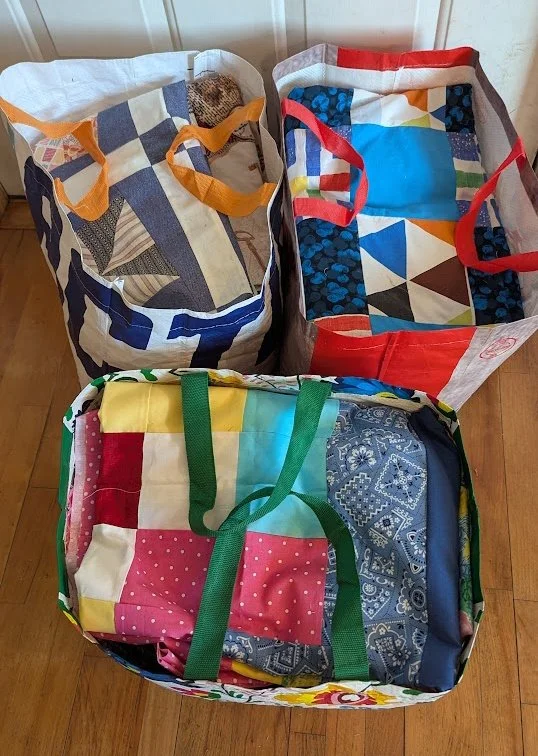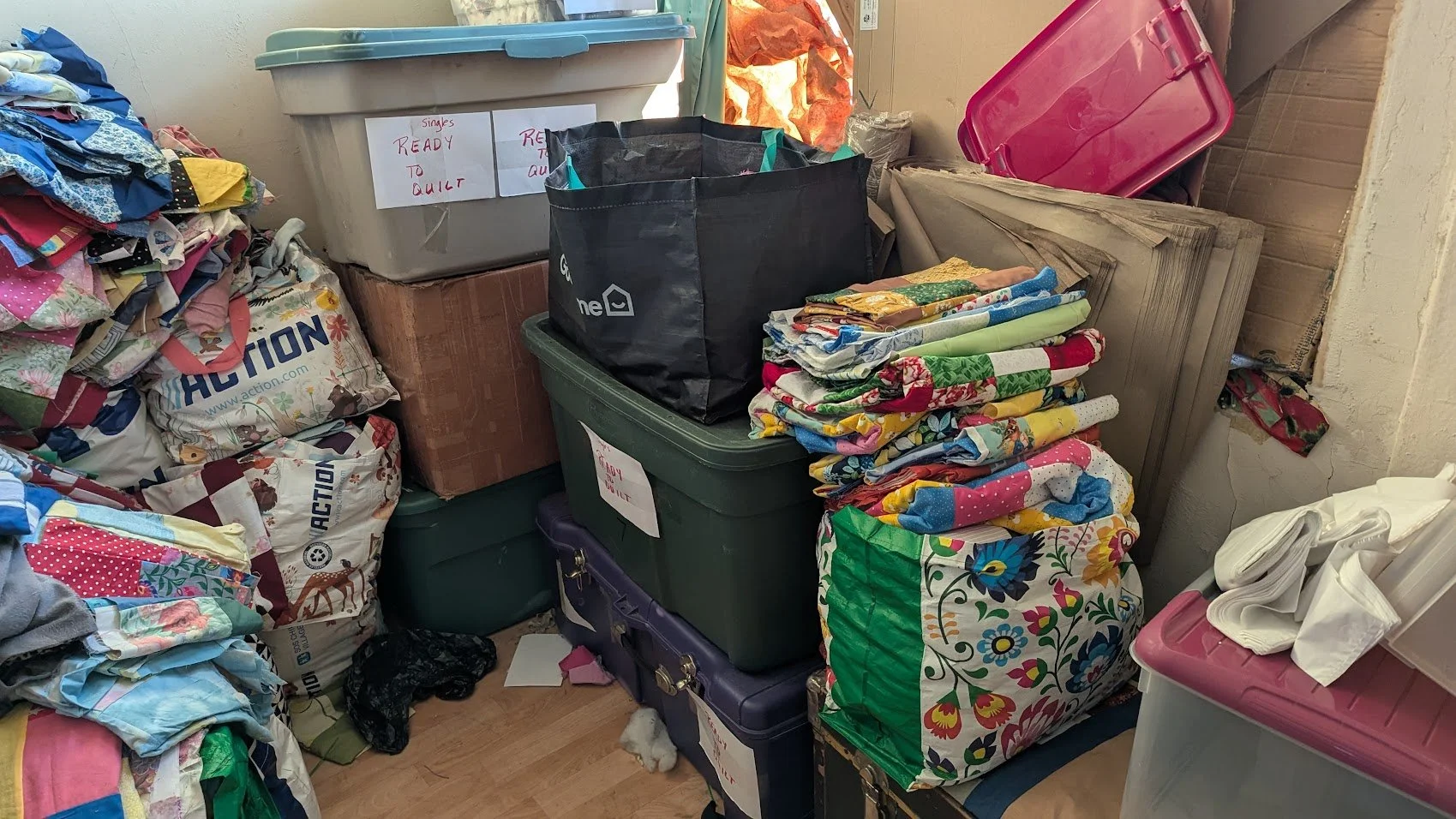Soon that big dark green/black bag will be taken away and used up as I have a bunch more of those little strips in there - but hopefully I can take that bag home in a few days and start to tackle them. These is also a trunk UNDER the Polish bag that has a bunch of tops in it that can be emptied out and I can put finished tops in it as the things in the trunk are not ready to quilt. So far I’ve not needed the space but soon I will.