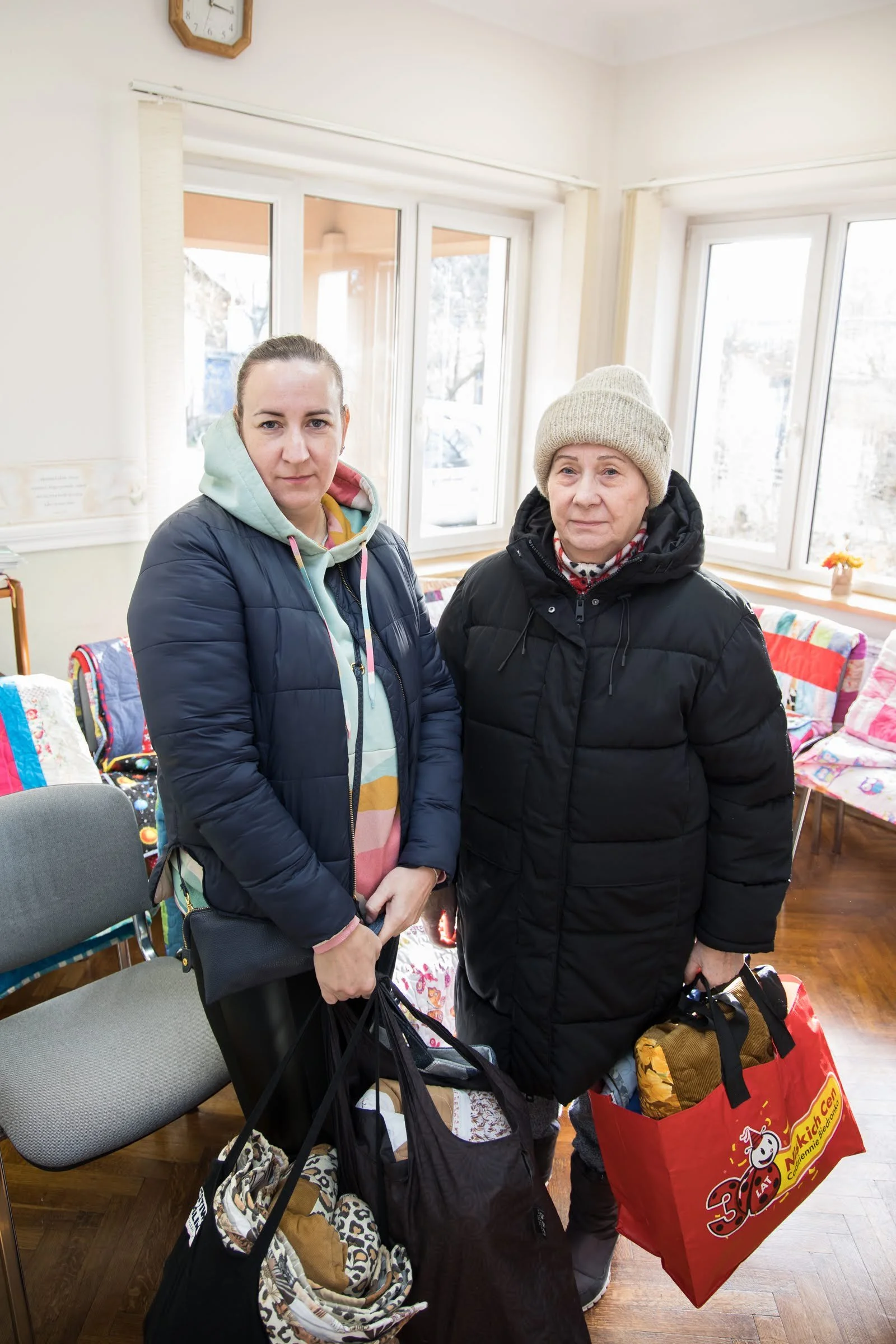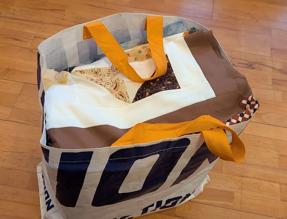 One great bit of news. A lady who received a quilt from us back in November has started coming to church. She’s Ukrainian. Well, she loves to sew and last week I asked her if she would consider helping me add borders to the tops I have because I have “so much work to do”. I took her up to this room and showed her. I then asked her if she would at least try to add borders to two tops, then I would bring the top and the fabric next week and she could take it to her house and try to do it. She could see what she thought and if all goes well - if she’s happy and I am happy, it would be wonderful if she could help. She agreed, so this week - a couple of days ago — I gave her two tops to add borders to - they were pretty easy ones as I didn’t want to scare her away! Anyway, the lady who said she would help me is the one in a black coat.