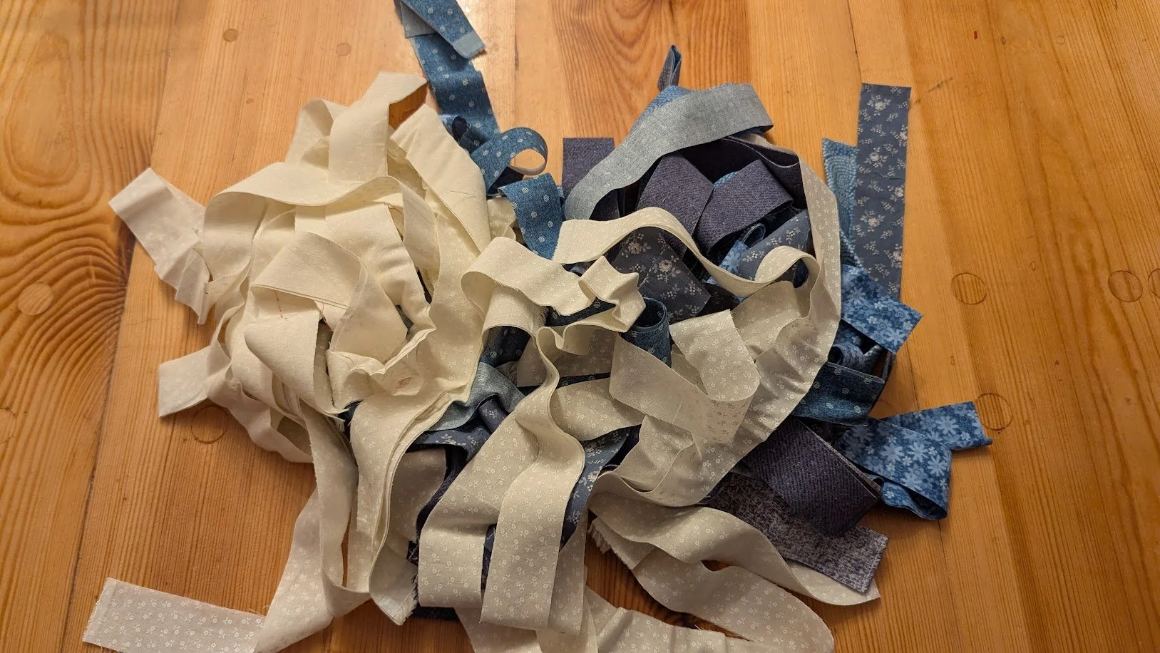 So this is where I am on this one. I just cut out strips - I am going to use a scrappy cream and grayish blues for the blue part in hopes it will be an antiquey looking quilt. We’ll see. I will just cut and sew and cut and sew. I don’t want a lot of leftover strips since these are cut at 1.25” and not a regular 1.5”. Normally if I cut too many, I don’t mind at all as I just throw them into my strips bags. However…these…not so much. I’m itching to start stiching strips on these now. I will make it scrappy. I am starting with this off white, but will go find some more so I’m not restricted to this cream. I want to use a variety of them.