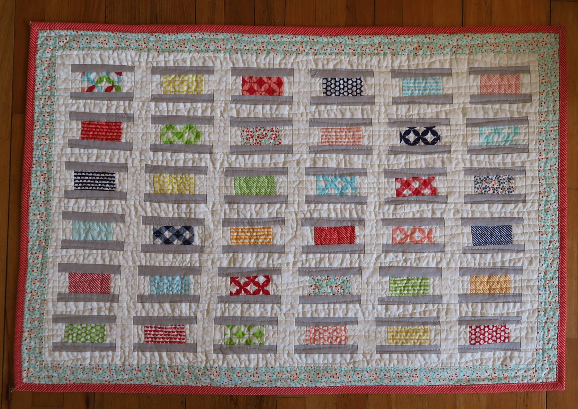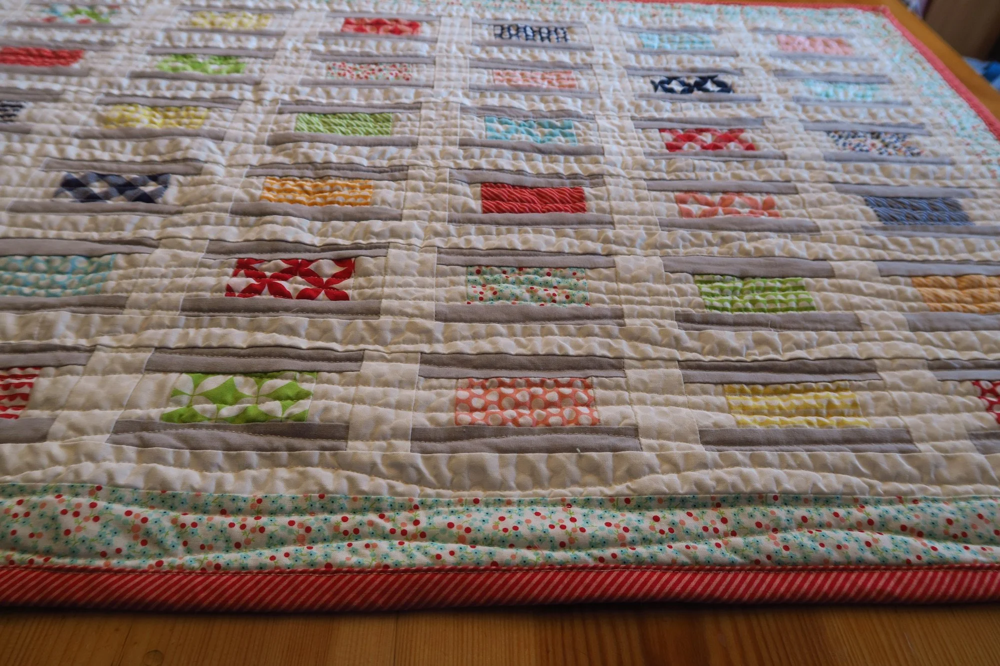 So I quilted it on my Janome and used those wavy lines with the walking foot. I thought a bunch of wavy lines might help the bit of wonkiness that was in the top sort of be diminished. And it did. I thought it turned out great!