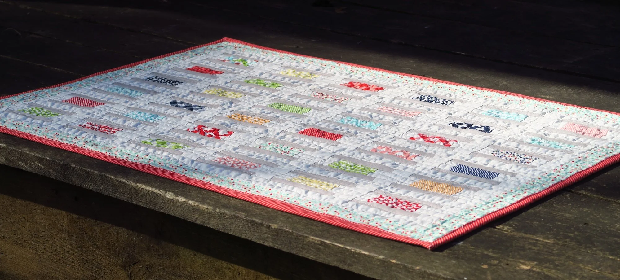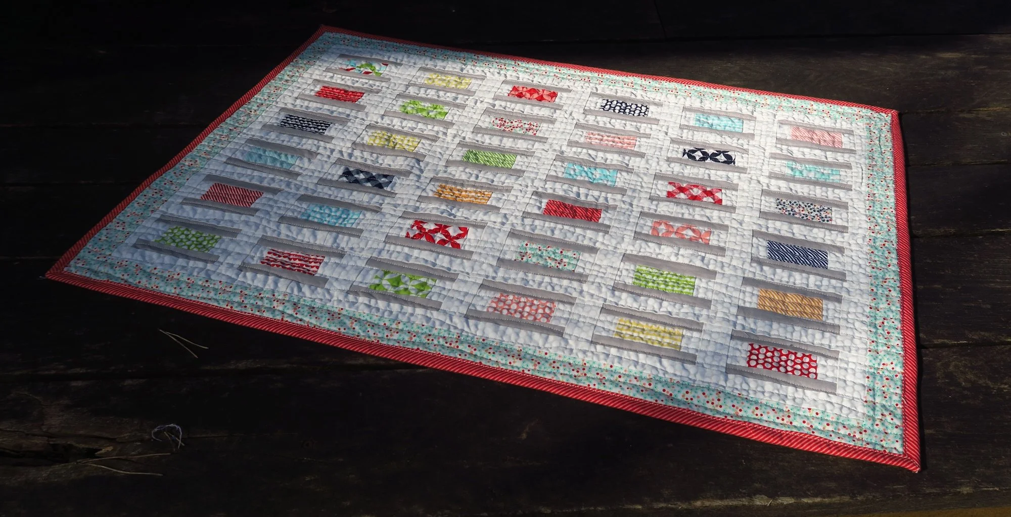 There was enough of the stripe left in the package of fabrics so that I was able to get enough binding out of it. But just barely. I’m glad, as I do like a stripe for a binding!