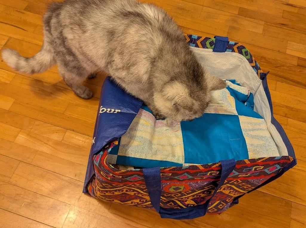 Below is Tuq, our cat, checking out what in the world I put in that bag. He really wanted to sit on them. At this point, I really don’t stop him because after I finish the quilts I do wash them and then do not allow them to sit on the quilts. He seems to be able to find the most recently washed quilt and want to sit on it!