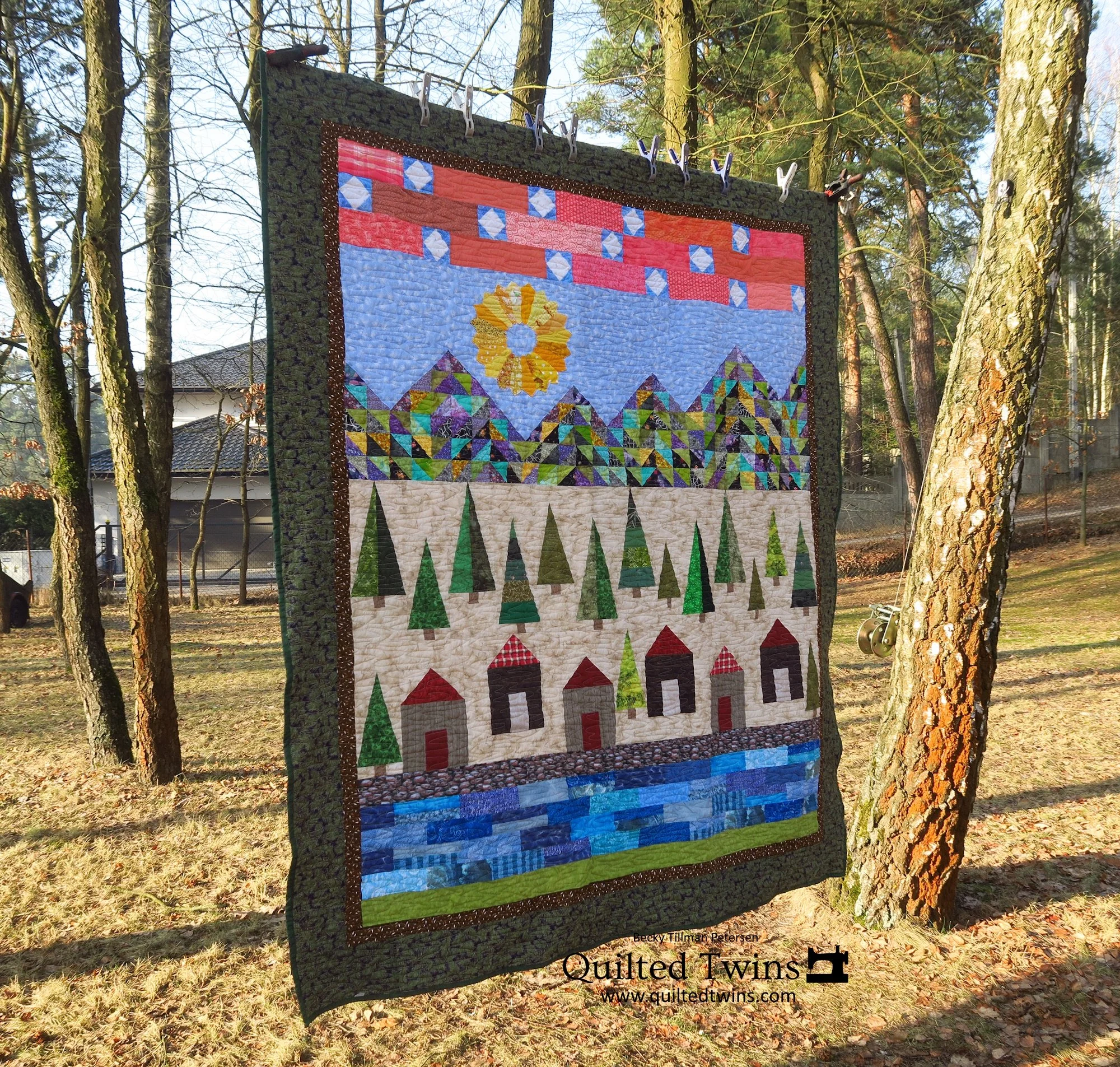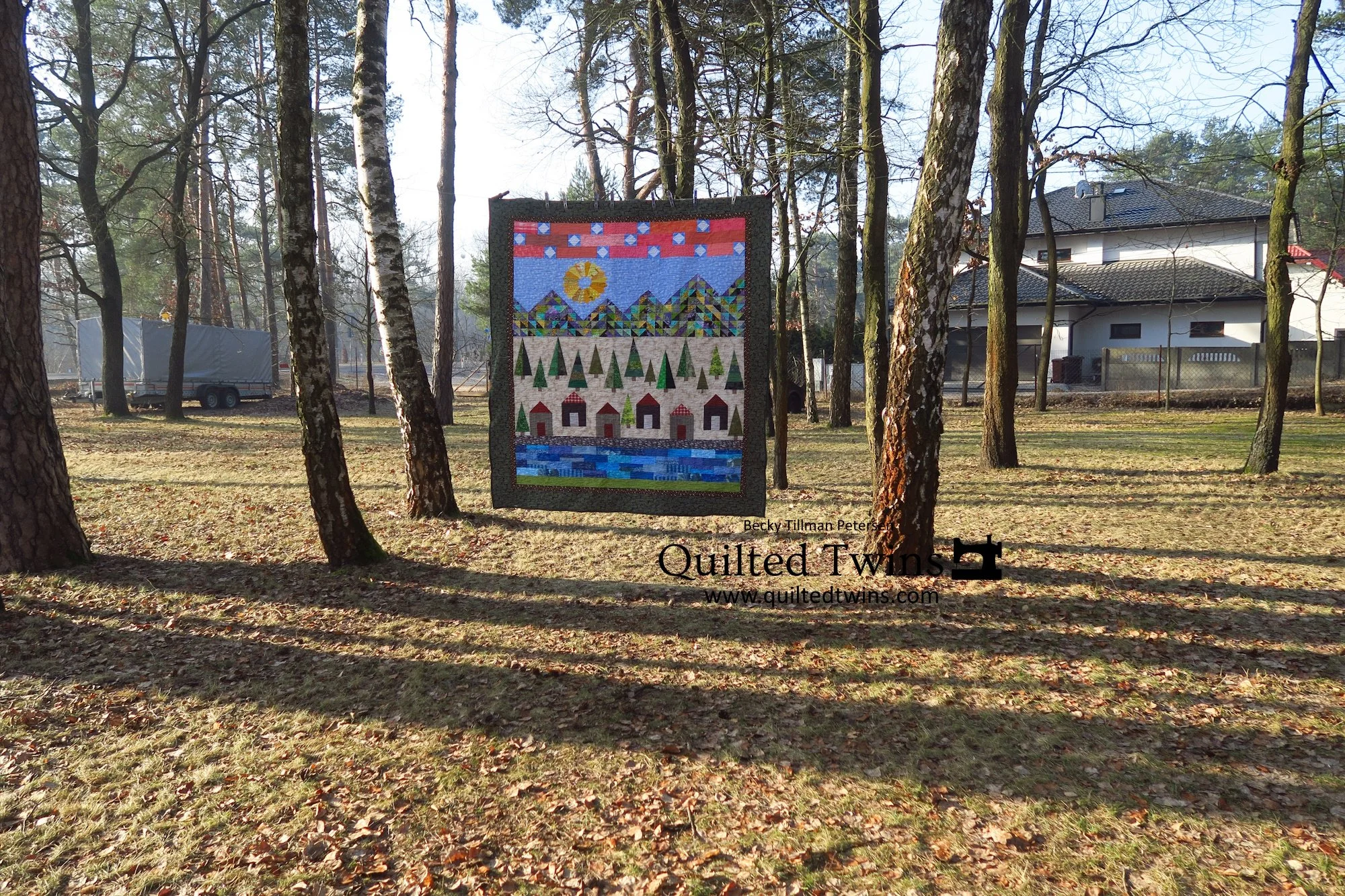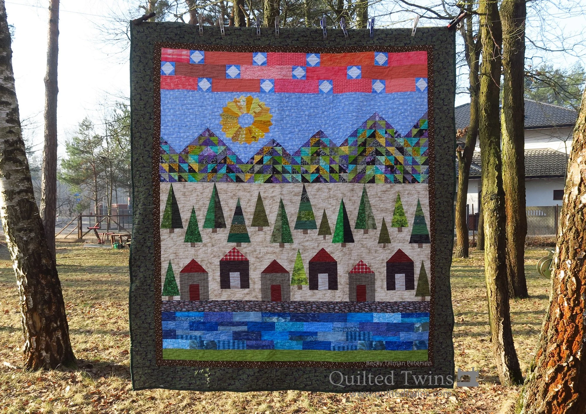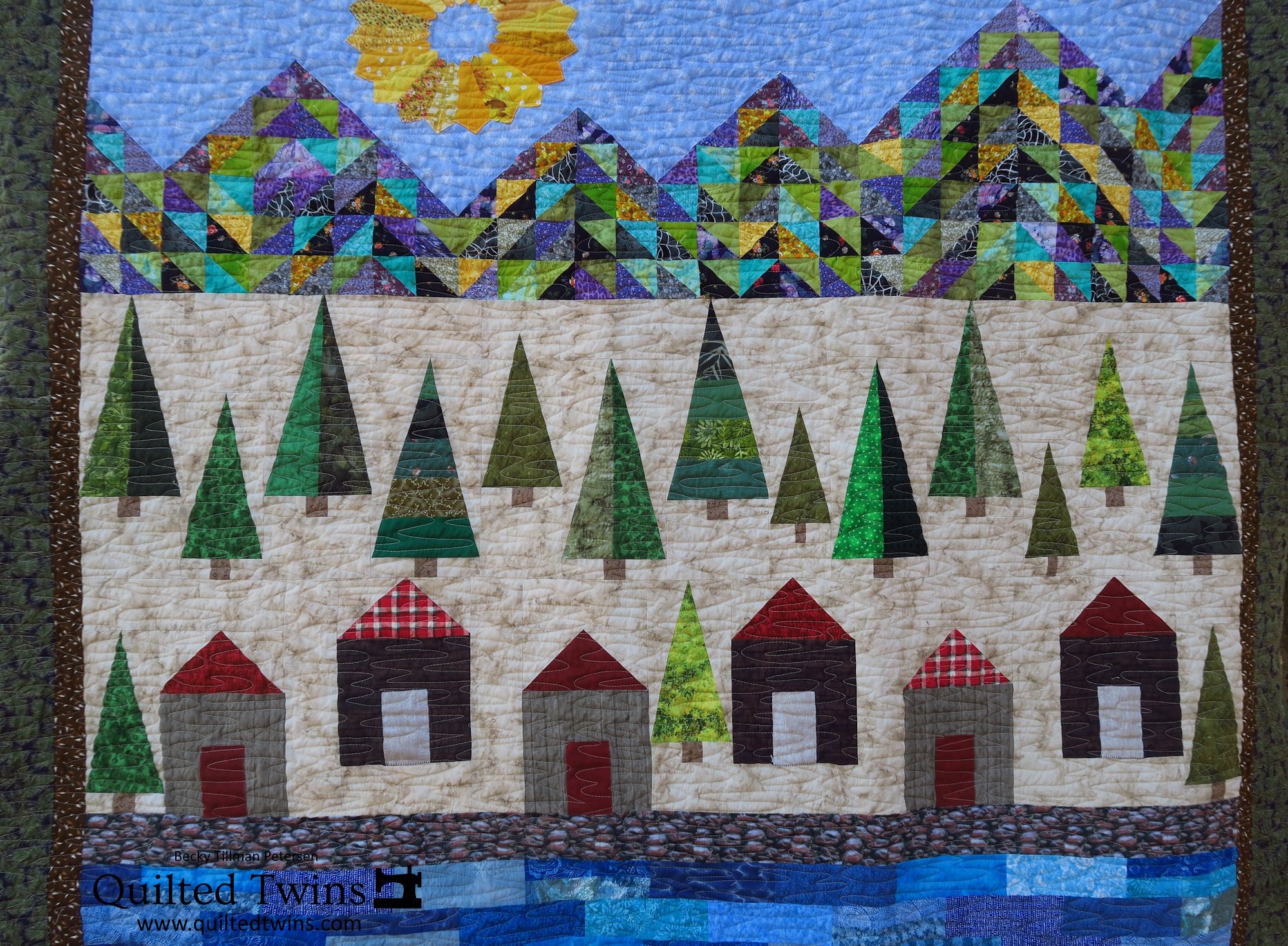 Edyta is the one who gave the name of this one Colorado. I would have liked even more detail on the quilt design, but I’m fine with it. I did add the doors to the cabins because we just had a suggestion of a cabin with a square of fabric with a roof, but no door. I wanted doors. Onoce I realized the cream doors needed some sort of definition to the bottom because they blended right into the background, I put a row of stitches across the bottom of the cream colored doors.