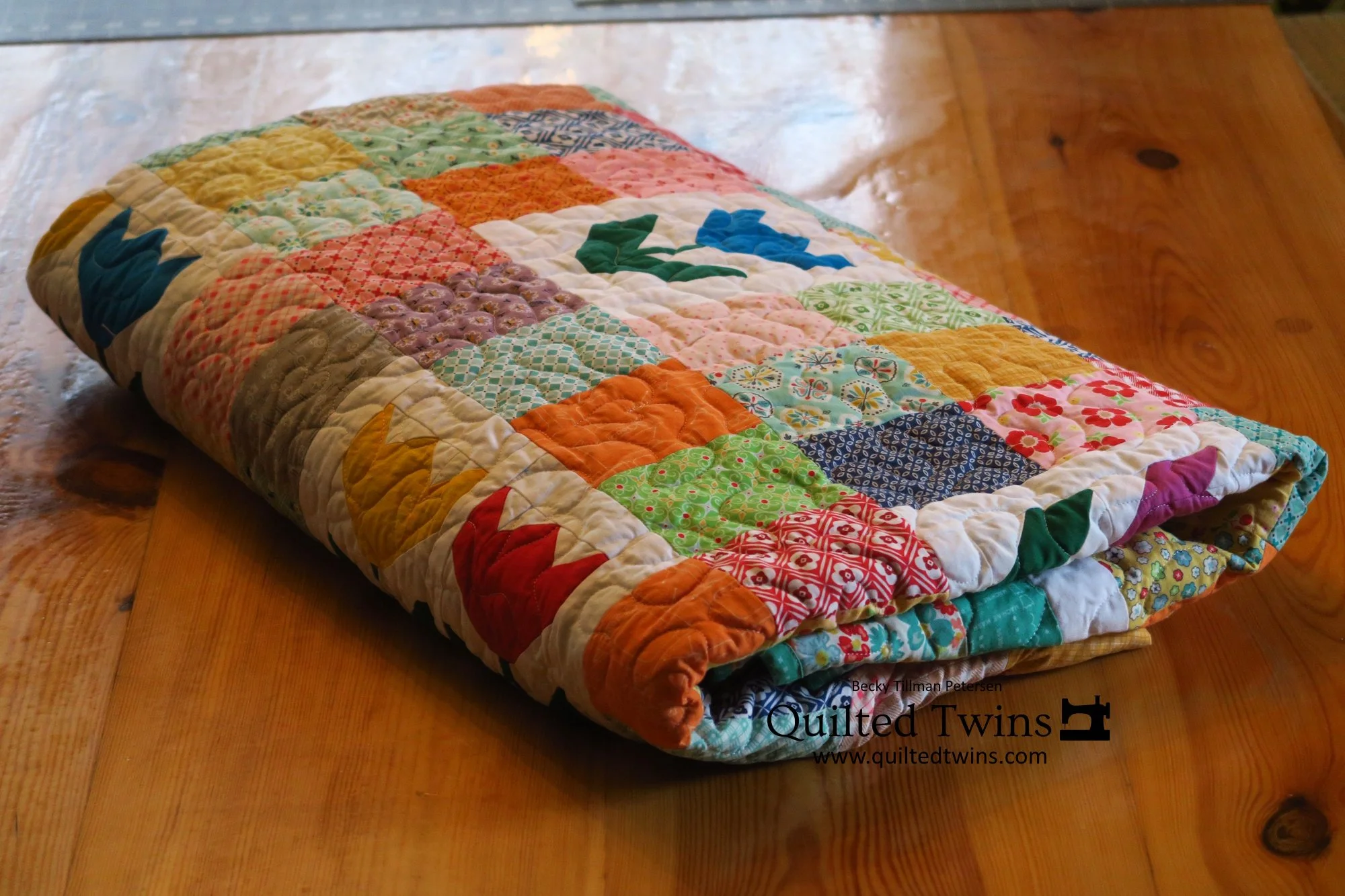 I also wanted to mention that even when with these tops, Lori makes them from one of her lines of fabrics - I don’t. I usually don’t even have enough of that one line to make that particular quilt. With this quilt, I really was just going for some bright colors and you can see that I did something very different for a Lori Holt quilt and that is that I used solids for the tulips themselves - both the flower part and the green leaves and stems.