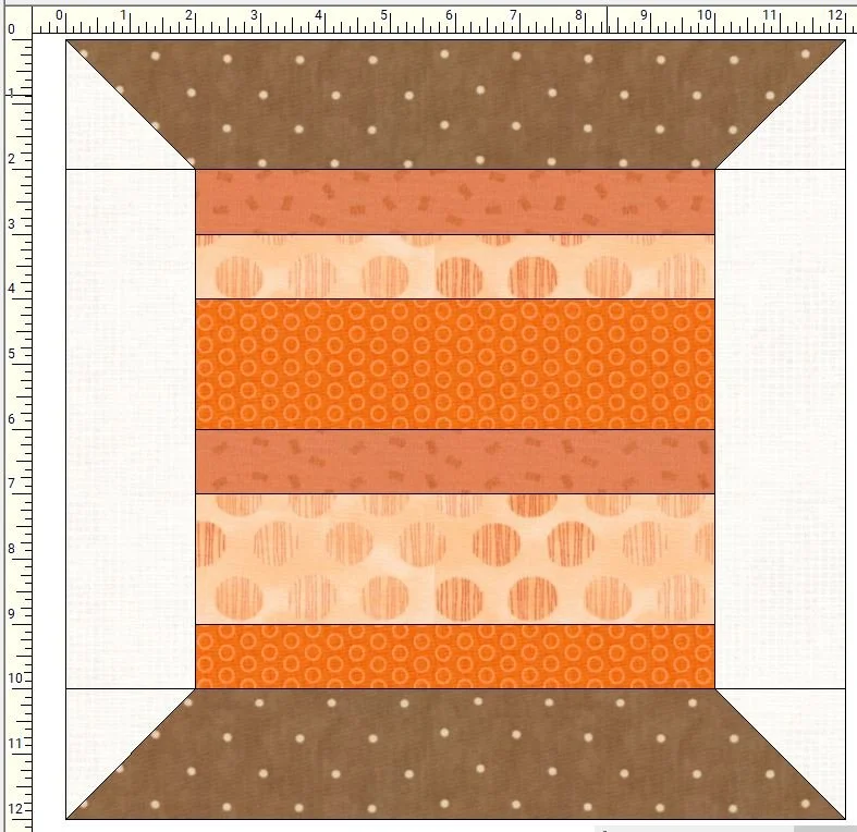 Anyway, I made rather large spool blocks. I made about a 9” square block of selvedges and then trimmed them to 8.5” square. Then I added a 2.5”x8.5” strip of white to each side and put the spools block top and bottom on with a brown strip cut 2.5”x12.5” and put a 2.5” white square on each end and did an easy corner triangle to make the diagonal line. The block looks like this: I showed the actual selvedges as colored fabrics.