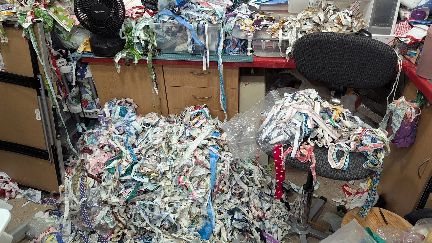 But let me share with you how awful my sewing area got while trying to find the specific colors needed for this top. As such, I was ready to get the blocks quickly made so I could pick these back up and thrown back in the bags. When I said I had a lot of selvedges, I meant it.