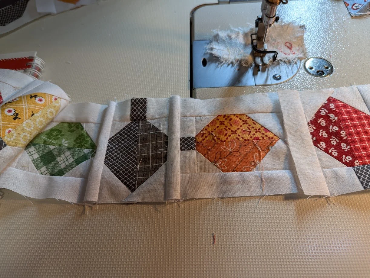 Now to me, these leaves look more like old fashioned Christmas light bulbs, but so be it. This is the way Lori Holt designed them. I didn’t use pink in the row, even though she used pink in her row. I kept to the colors of real leaves - so yellows/golds, oranges, reds, greens, browns.